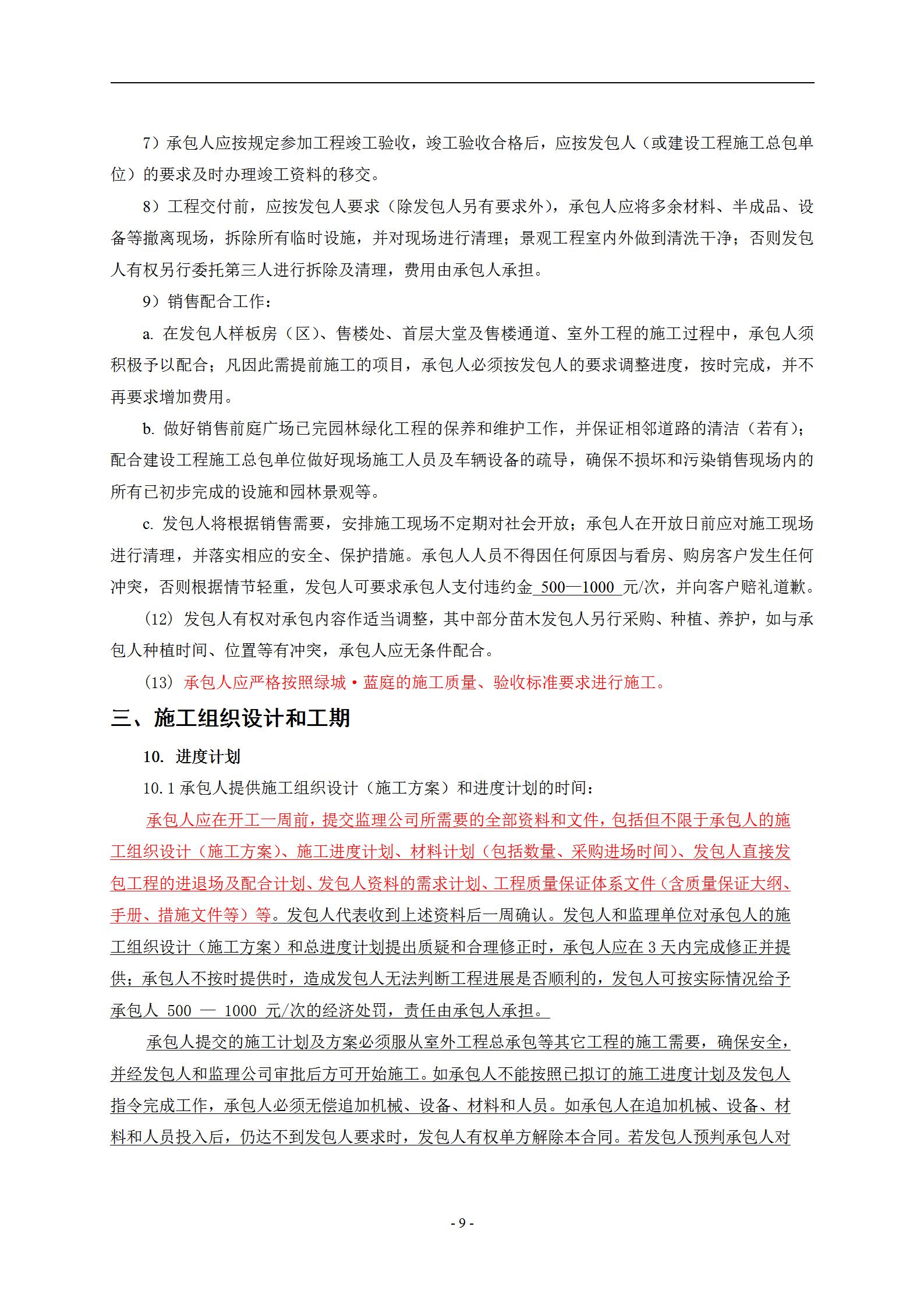 1. 本工程采用总承包方式,包人工、包材料、包机械、包工期、包质量(包括树木、花草的成活)、包安全施工、包文明管理、包检验、包维护、包验收合格、包质保期内维修、养护。