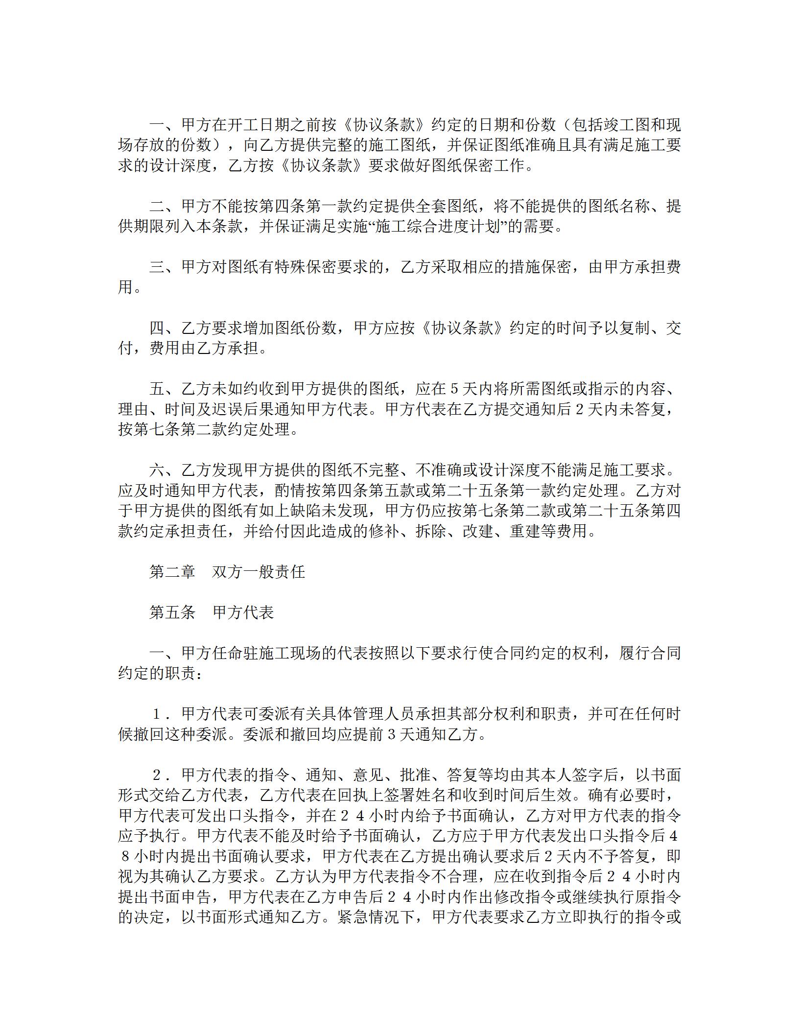 五、乙方未如约收到甲方提供的图纸,应在5天内将所需图纸或指示的内容、理由、时间及迟误后果通知甲方代表。甲方代表在乙方提交通知后2天内未答复,按第七条第二款约定处理。